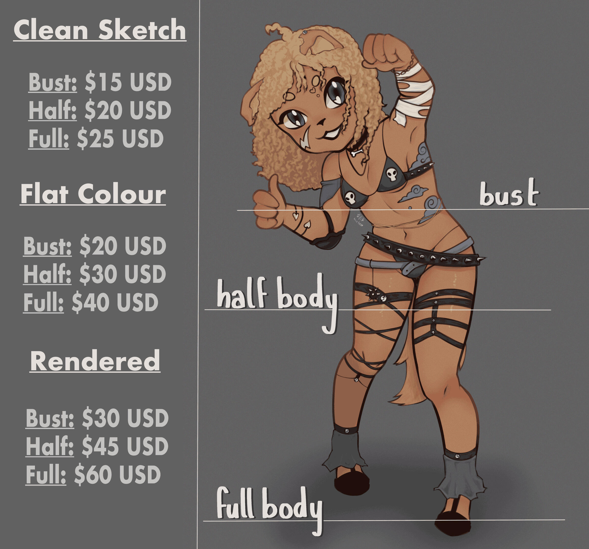 Won’t Draw — mecha, major gore, complex backgrounds, feral, loli/shotaI retain all rights to my artwork to promote and post on my page unless stated otherwise. The commissioner may use my artwork on their social profiles, and for personal use.